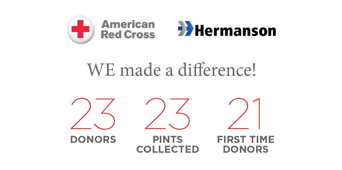 Hermanson recently partnered with the American Red Cross Northwest for a company-wide blood drive. We donated 23 pints of blood - that's almost 69 lives impacted!
